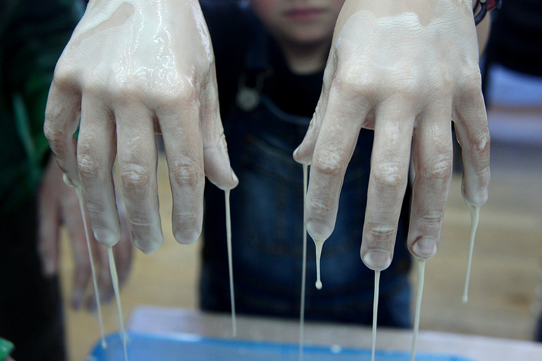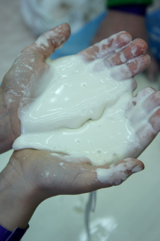 В том что если ударить по поверхности она твердая, а если мягко запустить пальцы, то жидкая. Что если интенсивно на нее воздействовать (мять, лепить) то она лепится, а если пальцы расслабить она стекает между ними.