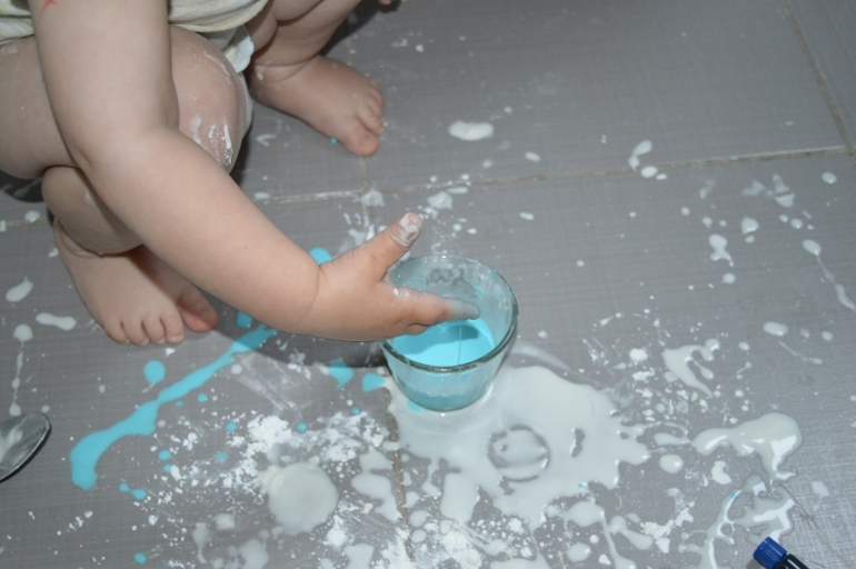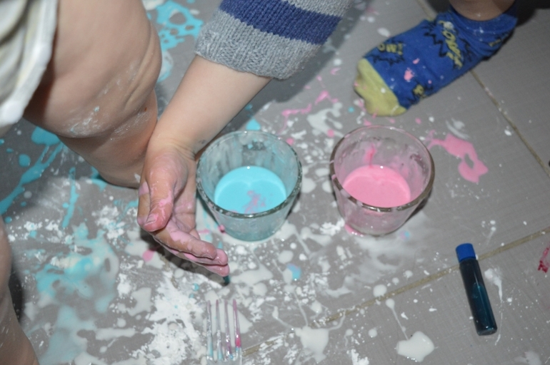Вот такая забава! Если еще не играли, советую и спасибо, что мне посоветовали)! мы развели три стаканчика и в каждый капнули пищевым красителем - получилось разноцветно. Отмылось потом все легко, что важно)).