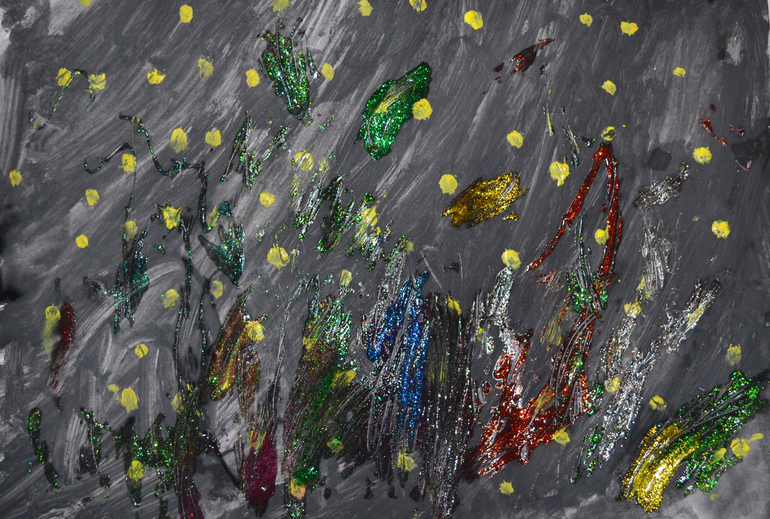 Мы попытались изобразить северное сияние при помощи гелей с блестками для рисования в тюбиках. Так как тюбиками рисовали первый раз-это увлекло надолго.