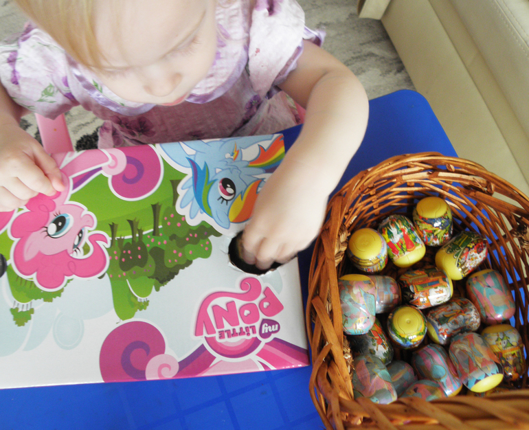Игра для маленькой Лизы: заранее подготовила киндеры с термонаклейками, по одинаковых набора с изображениями героев из сказок, задание - найти парочки или просто кидать в коробку-сортер: