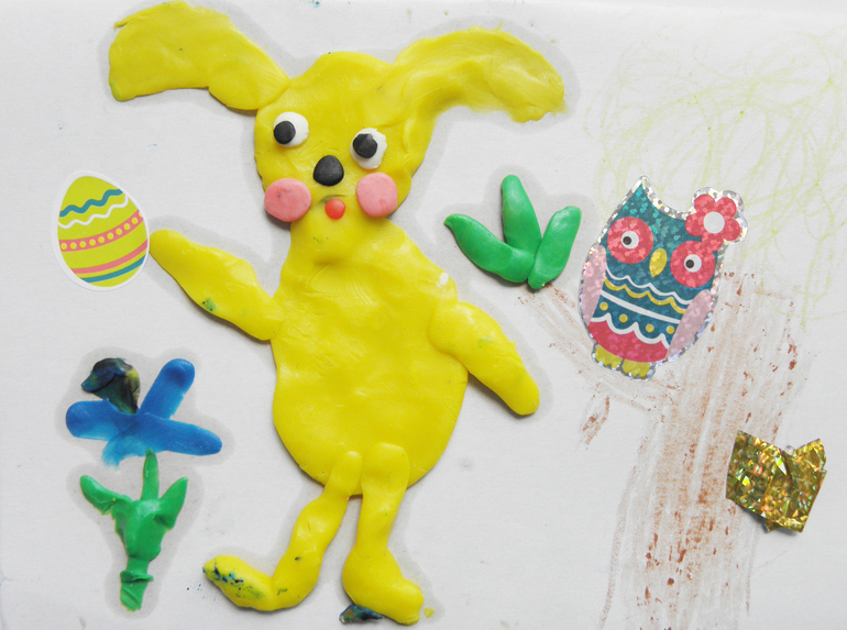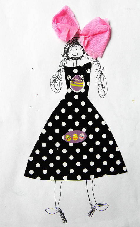 Еще одно любимое занятие Сони - я ей приклеиваю ей платья из обрезков бумаги, она придумывает хозяек этим платьям. Так что появилась даже пасхальная девочка: