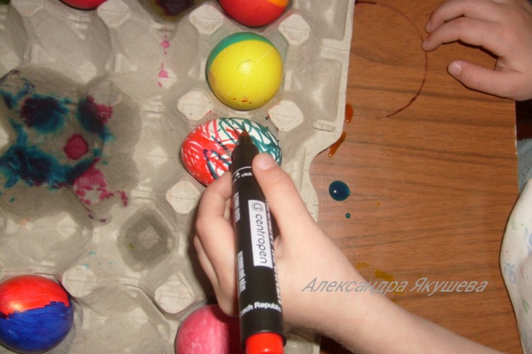 Или рисуем на яйце маркерами и заворачиваем в влажную салфетку с содержанием спирта