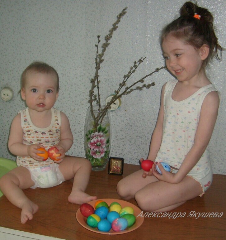 Ты про то' что они так смирно сидят на фотке?:-) я пока их фотала' Полина все яйца поразбила:-) Алена' глядя на нее' тоже начала их стукать:-):-):-) А Вероничка уже большая:-) помошица:-) чем вы крсили? Пищевыми красителями?