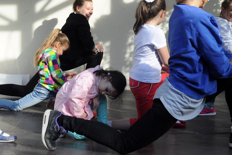 Попали на отличный танцевальный мастер-класс, тут шпагат на разминке: