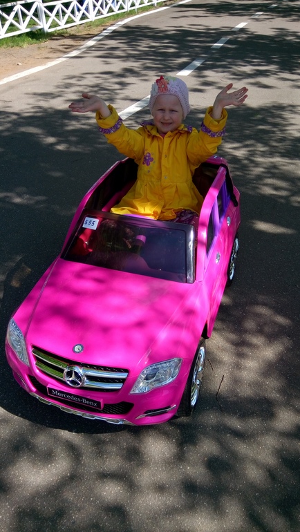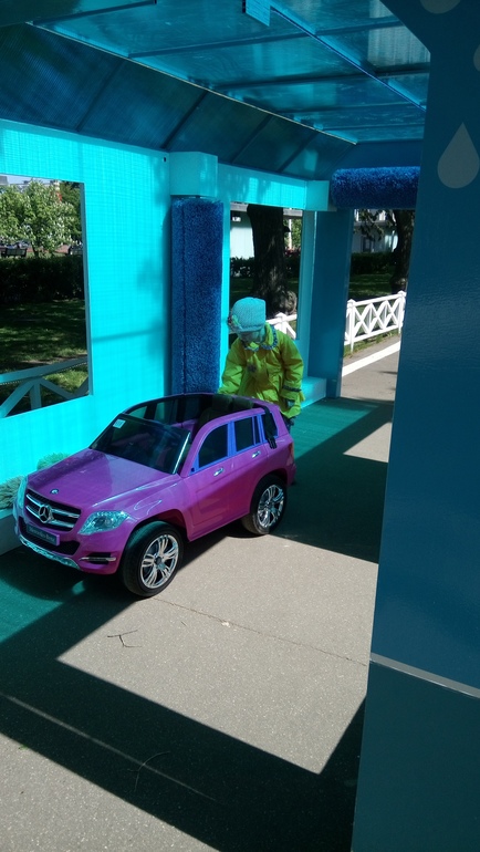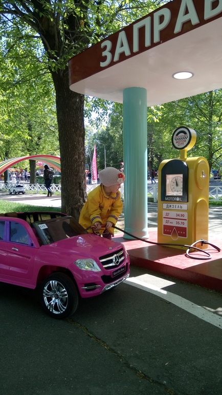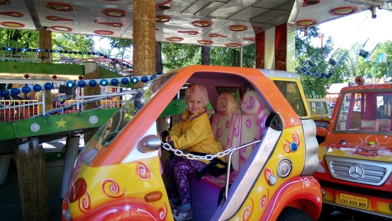4. А дальше около тех же аттракционов детский мотогородок, если не ошибаюсь. Суть, вы арендуете ребенку машину, есть на пульте, есть с педалькой и он катается по трассе, попутно заезжая на мойку, на пожарную станцию, ну и просто катаясь. А. наконец то справилась с рулем и педалью, так что есть кому водить машину, если что.