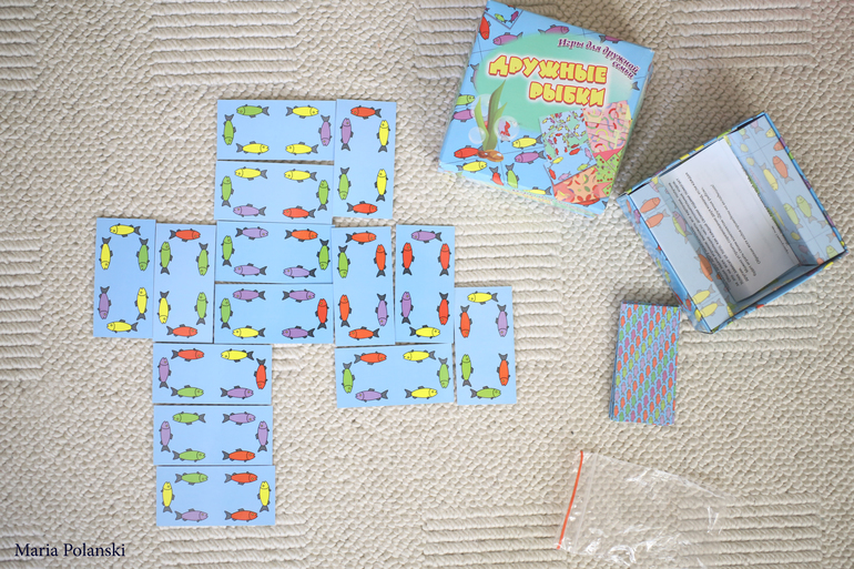 "Дружные рыбки". Совершенно дешевая игра, как-то раз прихваченная мной в Лабиринте до кучи для бесплатной доставки. А Варя ее обожает! Игра рассчитана на 2-4 игроков, мы играем всей семьей. Варе обычно кто-нибудь помогает. Задача подставлять карточки друг к другу так, чтобы образовывались по две пары рыбок одного цвета. Это очень интересно даже для взрослых! Развивает внимательность и быстроту поиска.