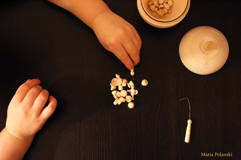 А это "Бирюльки". Когда меня в детстве мама ругала, она всегда говорила "нечего играть в бирюльки!". Для меня это всегда было фигуральным выражением как "Толкуникакого" или "Обстенкугорох". А оказывается вон она какая эта игра в бирюльки))) Мелкие детальки посуды насыпаются горкой и задача игроков (их два), тонким крючком вытаскивать по одной бирюльке, так чтобы не упали остальные. Кто больше собрал, тот и победил, а кто обрушил кучку, тот теряет ход. Простая игра. Варе очень нравится (такое развитие мелкой моторики, усидчивости и координации движений!), а мне скучновато.