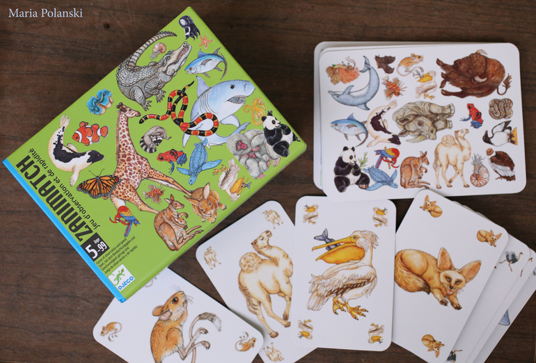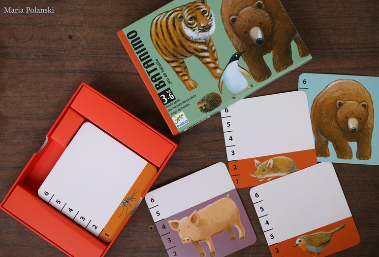 А это "Батанимо" тоже от Djeco. Тут суть игры в том, что игроки одновременно выкладывают на стол по одной карточке с верха своей стопки и смотрят, чей зверь выше, тот и забирает карточку с маленьким зверем противника. Если звери равны, то устраивается "бой", на каждую из них кладется по одной карточке в закрытую, а потом еще по одной в открытую и снова смотрят, чей зверь выше. Очень увлекательная игра на определение на глазх и по цифрам размеров зверей.))