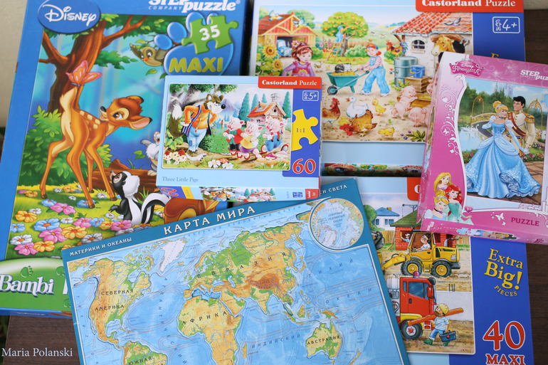 А ниже те пазлы, которые мы собираем сейчас. Больше всего мне нравится фирма Casterland, у них красивые картинки и превосходное качество самих деталей, которые плотно друг к другу прилегают и никуда не разъезжаются. А вот Step puzzle как попадешь. Вот с Бэмби очень хорошее качество, до этого у нас были малышовые по 2-4 детали тоже отличного качества, а с Золушкой гораздо хуже оказался.