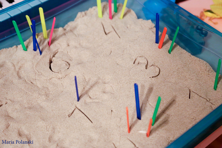 Ну и напоследок кинетический песок) Не знаю куда его отнести, пусть тоже будет к настольным играм. Кроме традиционных куличиков и приготовления еды с посудой, мы играем в поиск и закапывание сокровищ, строим что-нибудь (например зоопарк я построила по просьбе Варе, а то зверям негде жить). Песок можно утрамбовать и рисовать на нем, так мы изучали геометрические фигуры, цифры и буквы. А еще можно в него что-то втыкать и опять же строить, создавая миры. Можно оставлять на его поверхности следы животных. А еще можно играть в стройку (Варя очень любит тему ремонта дорог и тракторов\экскаваторов).