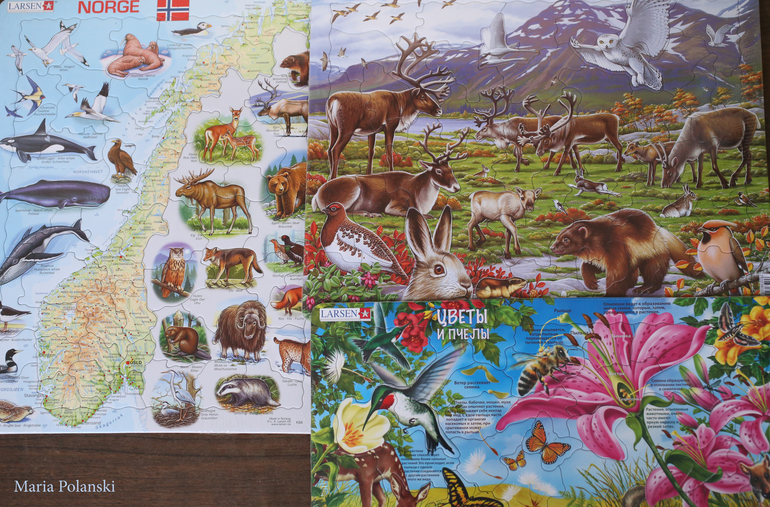 Ну и наши пазлы сейчас. Сверху немного на вырост с нестандартными по форме деталями. Такие пазлы собирать весь нелегко. Зато какие красивые! За Норвежский спасибо Гузель)) А два других фирмы Larsen.