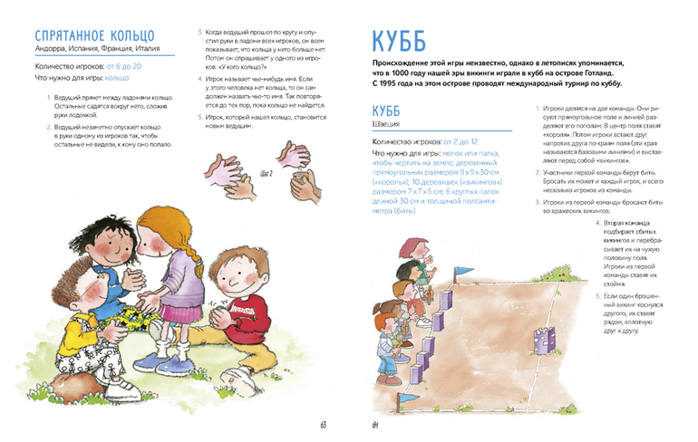 Игры разделены на группы (тип игры, ее цель, нужные для нее предметы), чтобы быстро найти ту игру, которая интересна ребенку прямо сейчас. Названия игр написаны разными цветами - так ребенок может понять, из какой они части света.