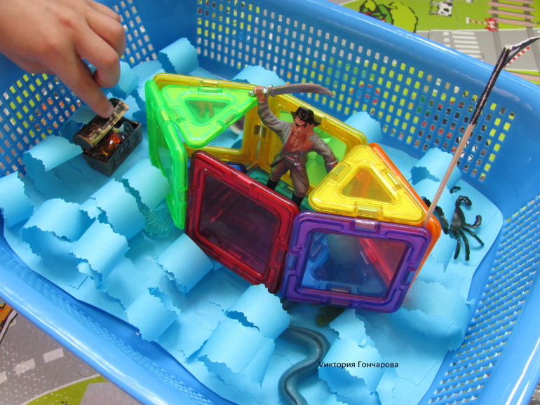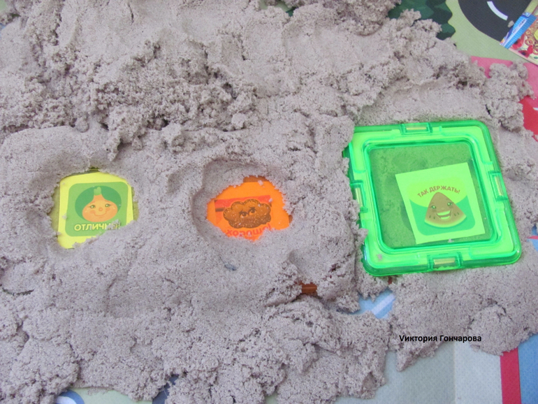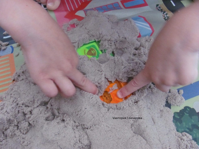 Вот примерно так мы и раскапывали клад, спрятанный под цветными окошками кинетическим песком.