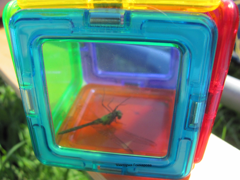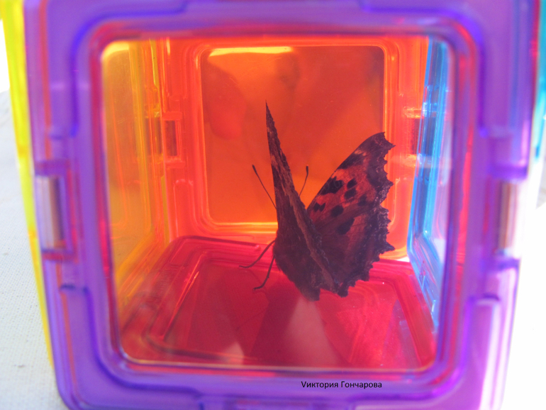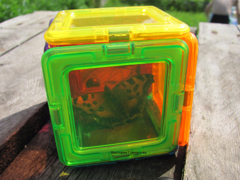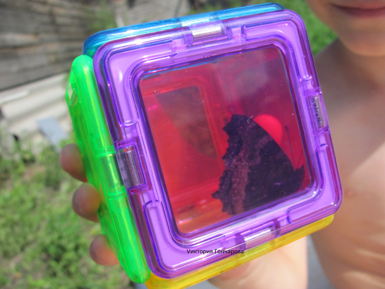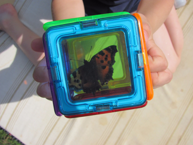 Лето, солнце, жара, ну и конечно различные насекомые! Совершенно случайно нам удалось поймать бабочку. И после этого случая у ребенка возник дикий интерес к этому виду насекомых. Кстати бабочку мы поместили в очень красивый контейнер для изучения насекомых- конечно его смастерили из конструктора)) А как же еще нам рассмотреть ее со всех сторон?