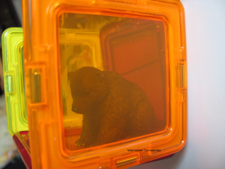 Рассматривали животных и заметили что, при просмотре через разные окошки - медвежонок меняет цвет.