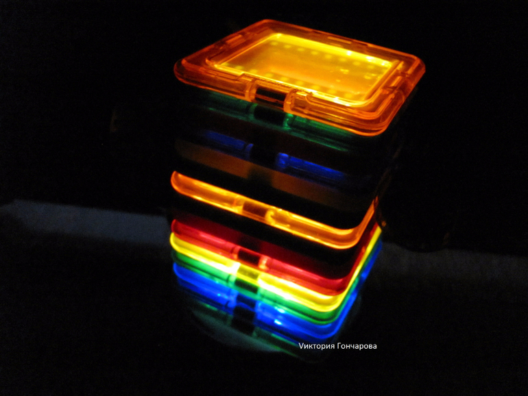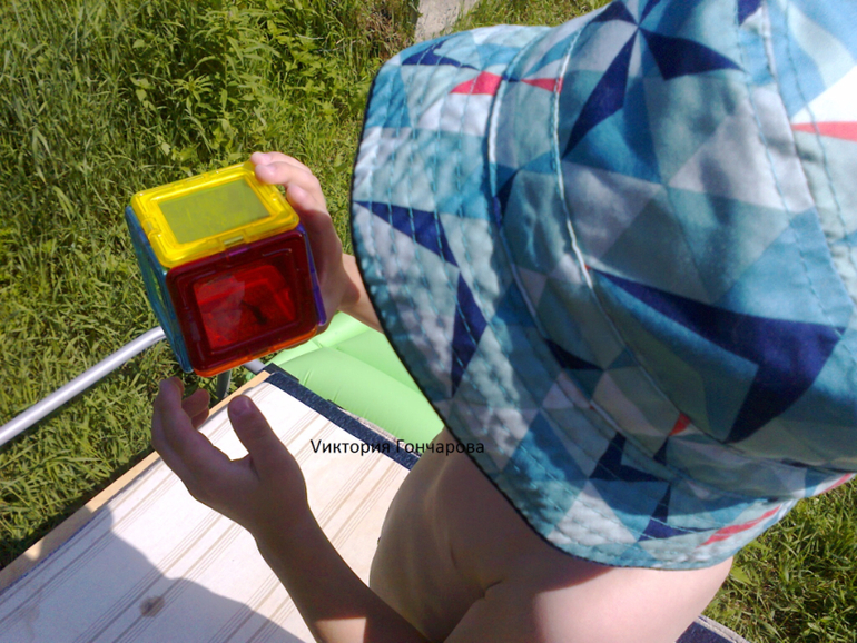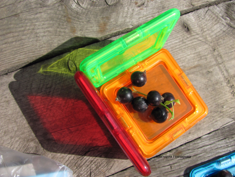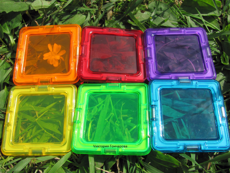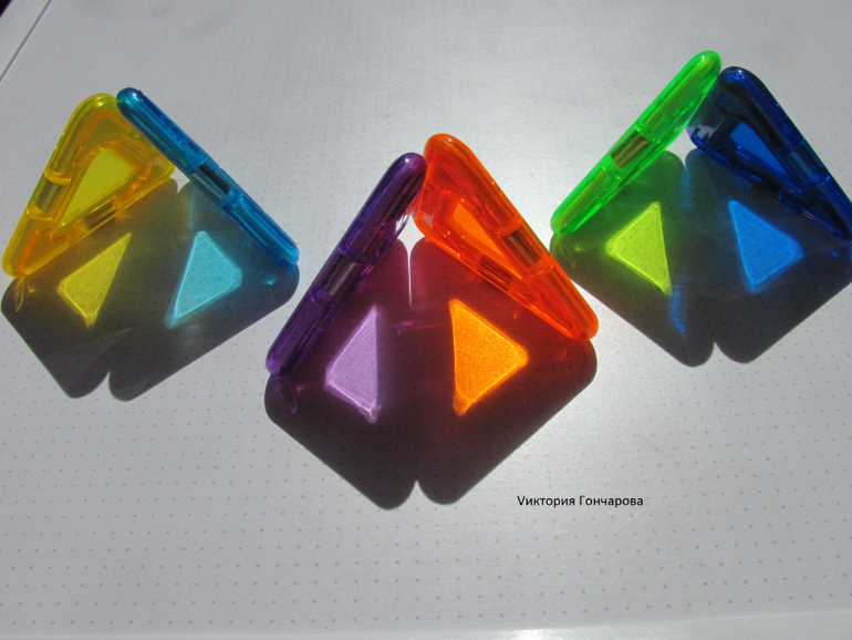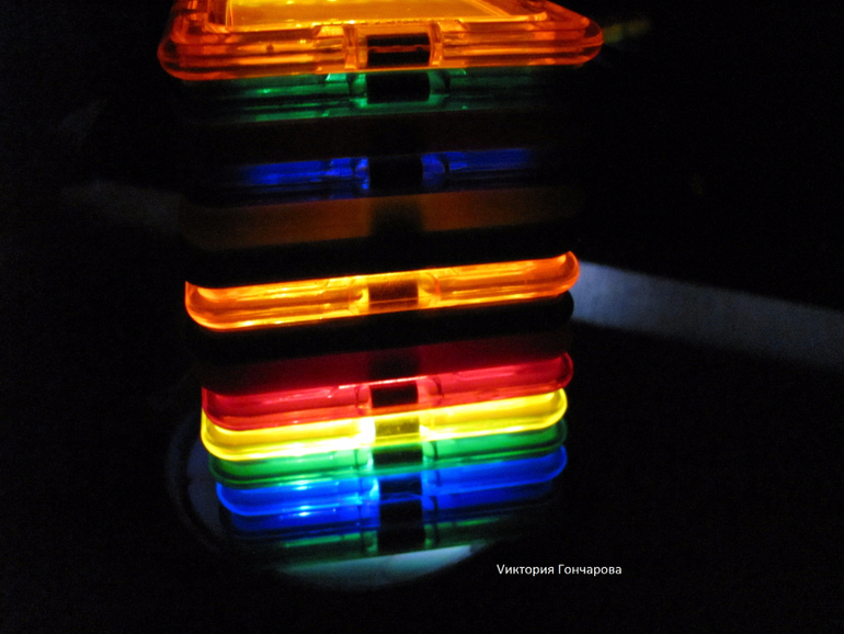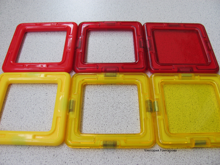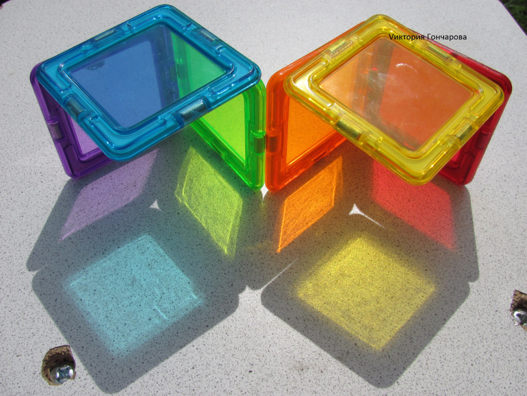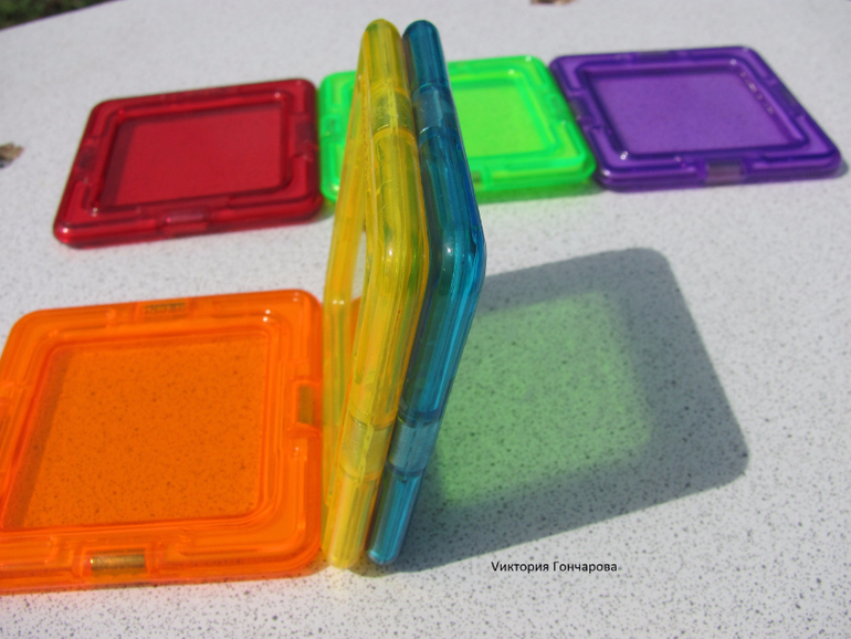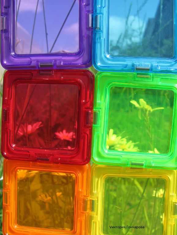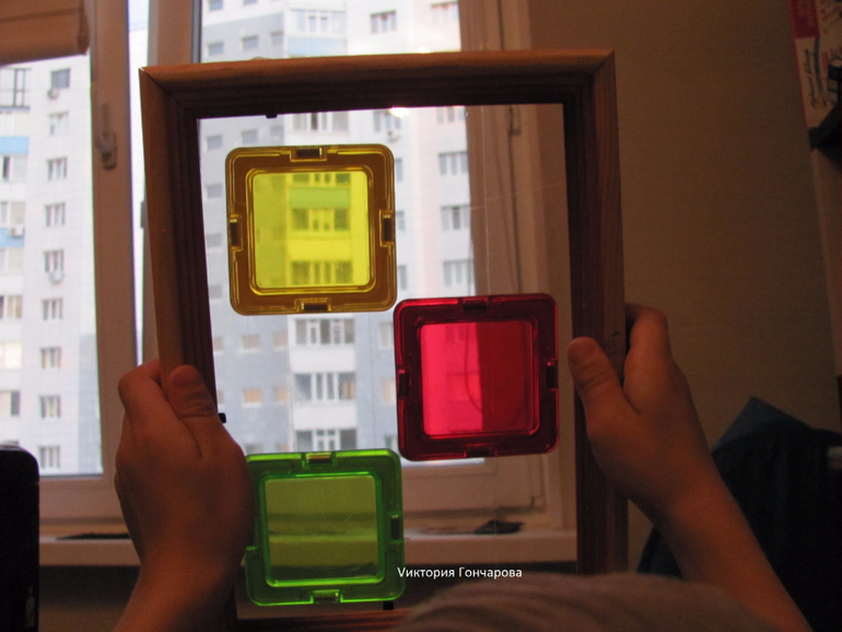 Дальше ребенок открыл еще одно свойство этих окошек - получение нового цвета. Если сложить два (или три) разных (у нас пока одинаковых нет)) окошка вместе, то срабатывает эффект смешивания как в красках, и получается другой цвет.