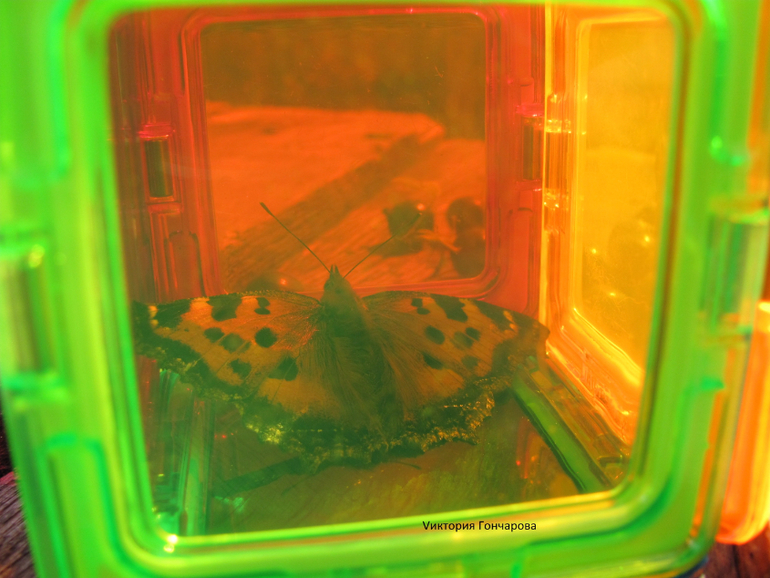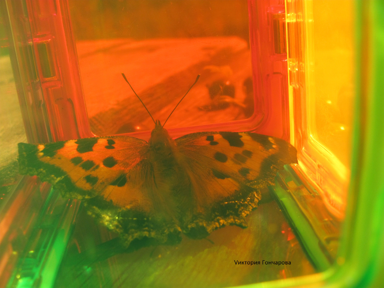 Рассматривал буквально все - от крыльев до усиков. А еще заметил что бабочка тоже меняет цвет, в зависимости от того, через какое окошко на нее смотреть.