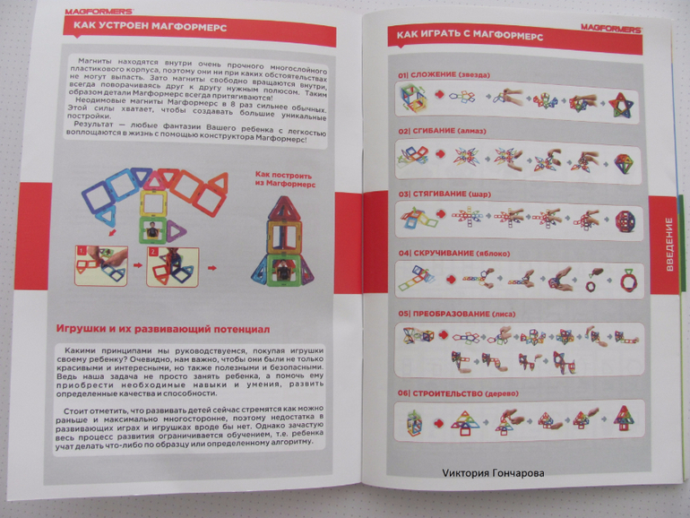 Дальше рассказано как собирать из этого конструктора. Вы скажете мне - очень просто примагничиваешь и все тут. А нет...Можно стягивать - это как раз эффект создание 3д фигур. Дальше сгибание - в нашей практике тоже есть этот вид строительства. Строительство - вот это просто примагничиваешь детали друг к другу, это начальный этап построения фигур. И последний скручивание - очень веселый вид, и ребенок, кстати сам как-то додумался до этого.
