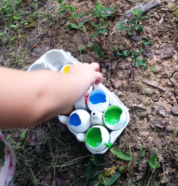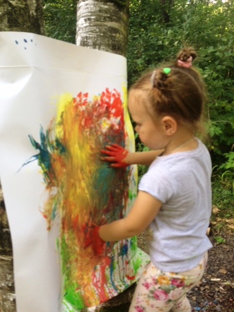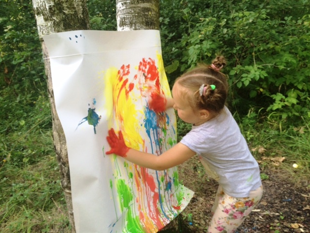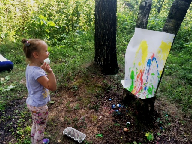 Сегодня мы наполнили краской яичную скорлупу, привязали к березкам лист ватмана и веселье началось.