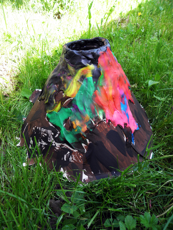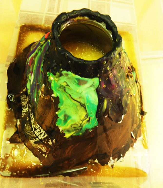 В это раз вулкан у нас был большой, аж из двухлитровой банки))) Все остатки пластилина на него и ушли)