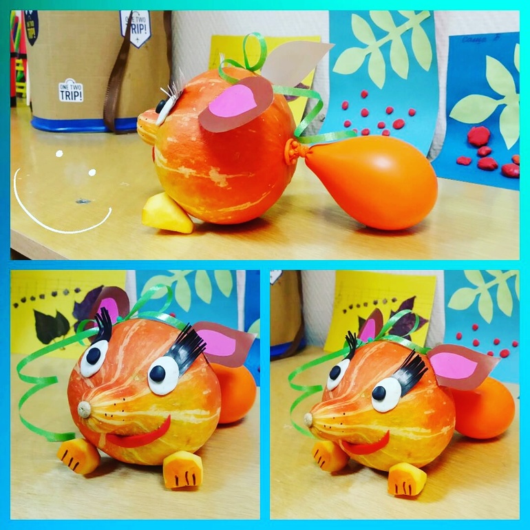 Потребовалось: оригинальная тыква, цветная бумага, шарик, булавки, пластилин, маркер, зубочистка и ленточка.