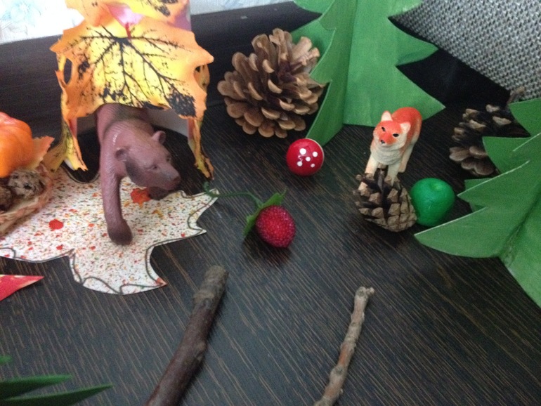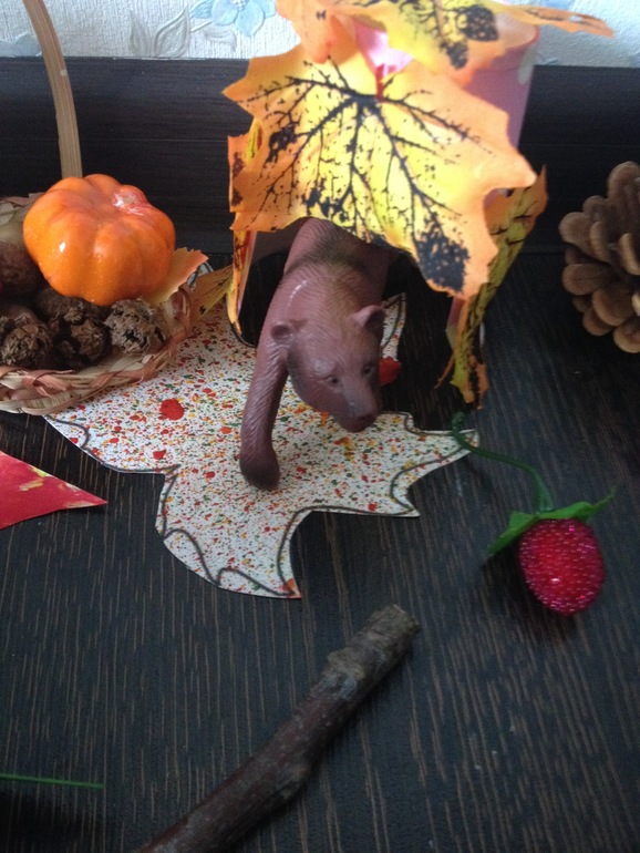 Мишка выходит из берлоги, рядом стоит корзина с запасами на зиму. Саша собрала огромную корзину для миши и поставила возле берлоги, на случай если будет холодная и голодная зима))