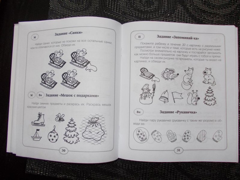 64 страницы развивающих занятий. Книжки выполнены как школьная тетрадь. Картинки черно-белые, но задания нам очень нравятся и есть все: логика, память, мышление, подготовка руки к письму и даже выражение эмоций.