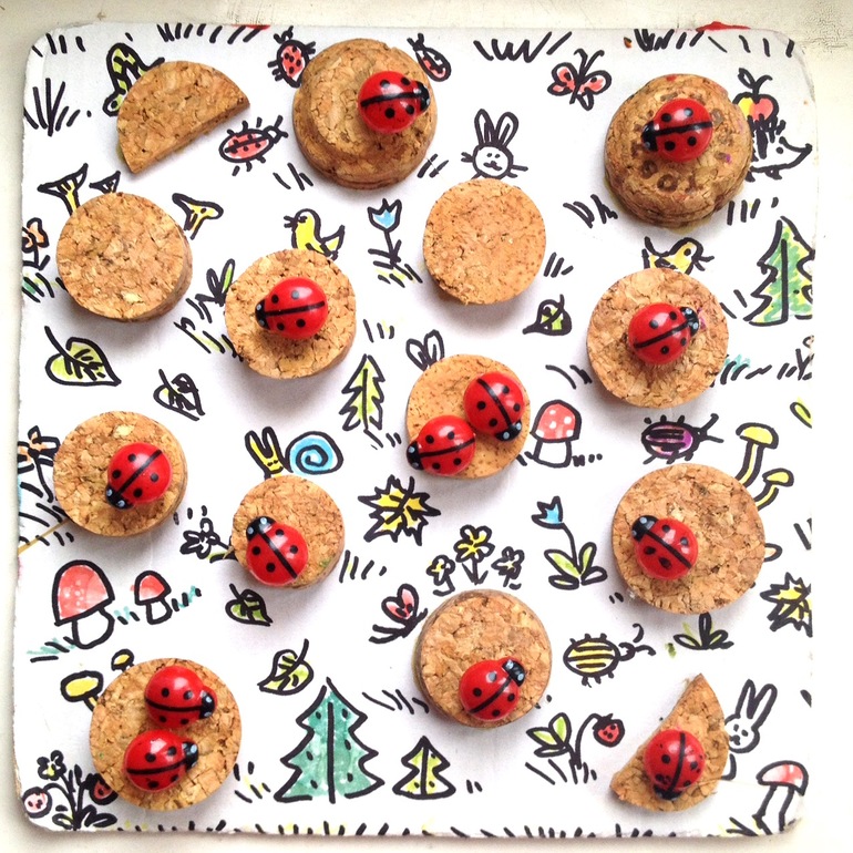 Божьи коровки сели на пеньки. Заготовку делала из картона, приклеивала пробки. Часто в нее играем, втыкаем всевозможные кнопки.