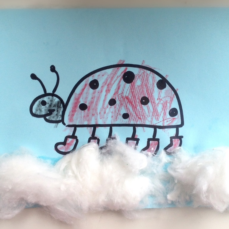 Раскрасили картинку и приклеили ватку, божья коровка ходит по облаку (под стишок "божья коровка, улети на небо")