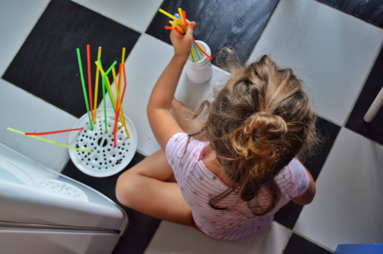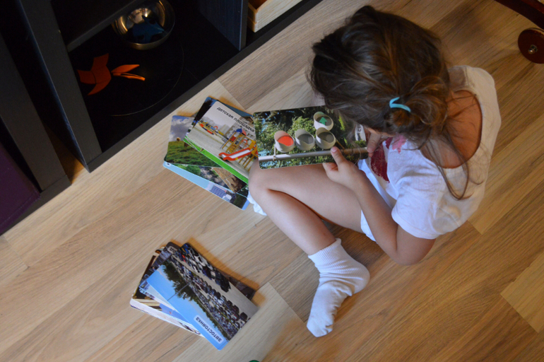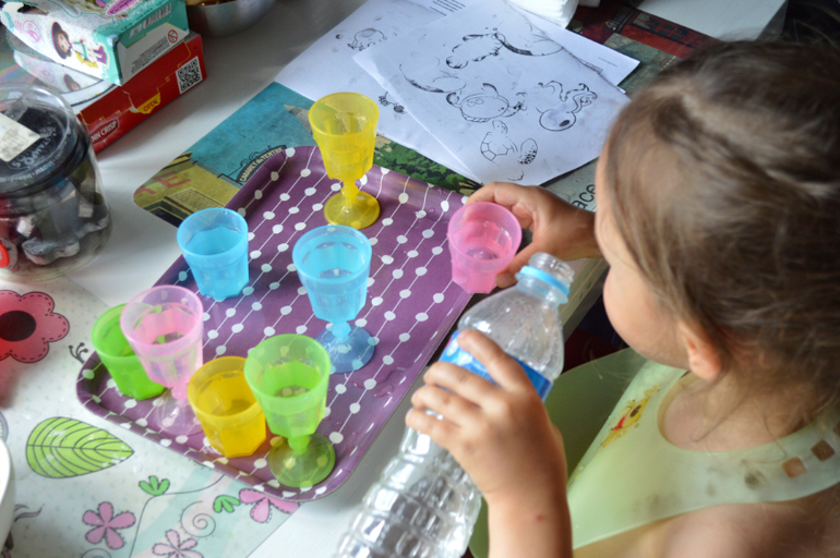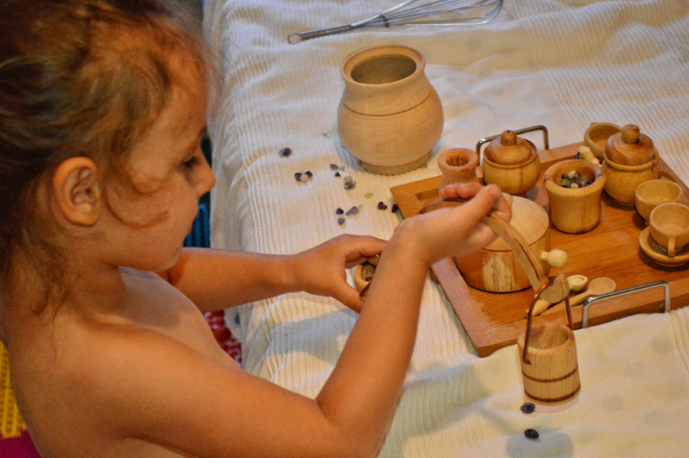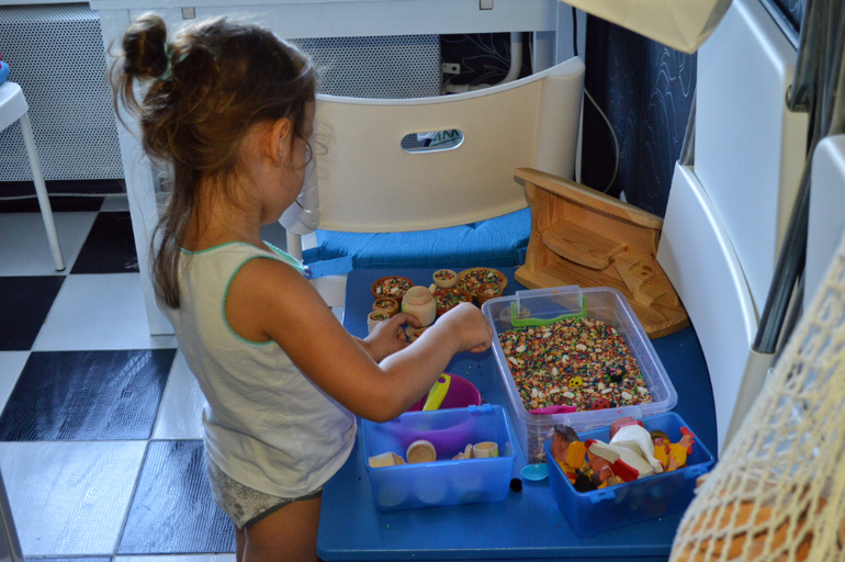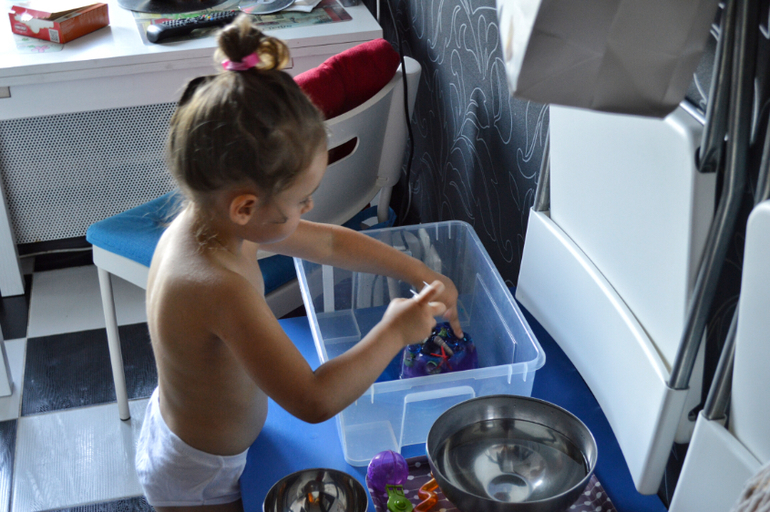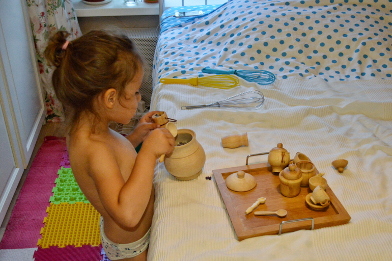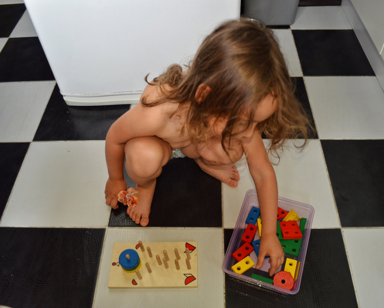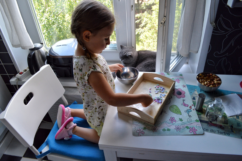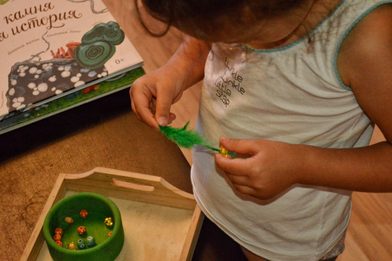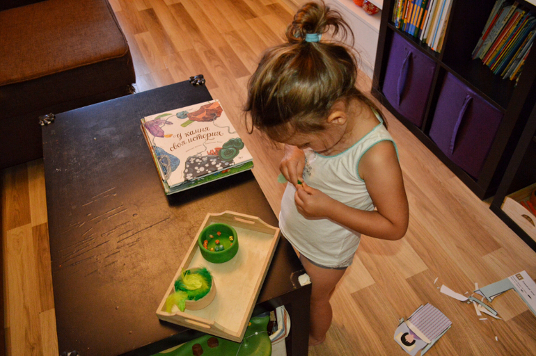 Все, что вы видите на фото-Дашина самостоятельная работа. Практически все. Я лишь предлагаю ей на подносах разные сортировки, короткие игры, которые могли бы заинтересовать ее и подстегнуть на самостоятельную работу. Сейчас, в принципе она занимается самостоятельно. А летом мы практически и не играли дома вместе. Летом все время на улице, в парках, в театрах, а тот минимум, что мы были дома, я пыталась поделать домашние дела. Есть то тоже надо. И она прекрасно занималась это время сама.