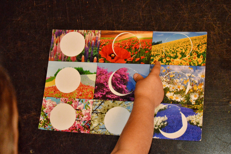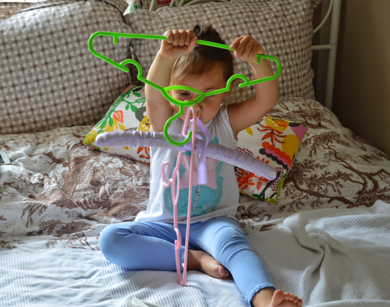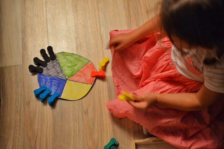 Простое упражнение с прищепками. Даха считает их и распределяет по цветам.