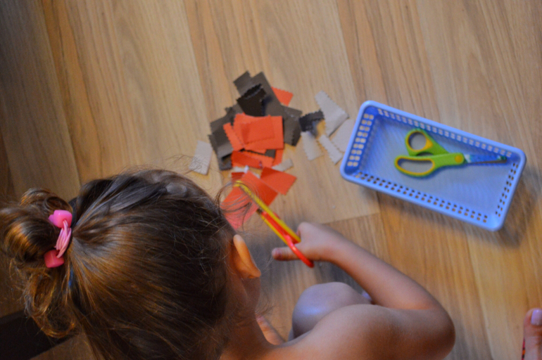 Давайте малышу возможность и время научиться самостоятельно. Я уже больше года периодически кладу Даше ножнички и бумажки на подносе. И она реально научилась вырезать сама. По бумажкам и Кумонам. Сегодня вот круто сама разрезала кумоновскую радугу по цветам. Я лишь иногда прошу закончить работу и подрезать излишки или подровнять срез.