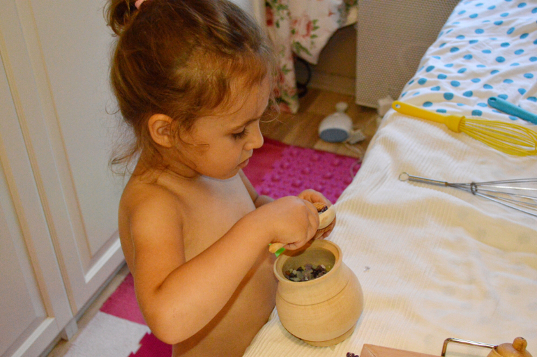 Часто достаю нефритики, павлиний глаз, ещё какие-то камушки из закромов. Они ведь маленькие, все разные, холодные. Ребёнку нравится их просто рассматривать, пересыпать. Можно предложить разные емкости: пластик, металл, дерево, стекло и слушать разное звучание камней.