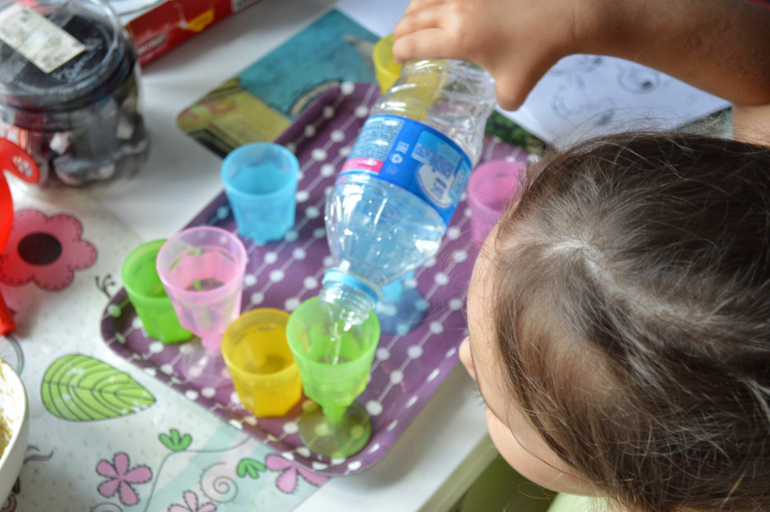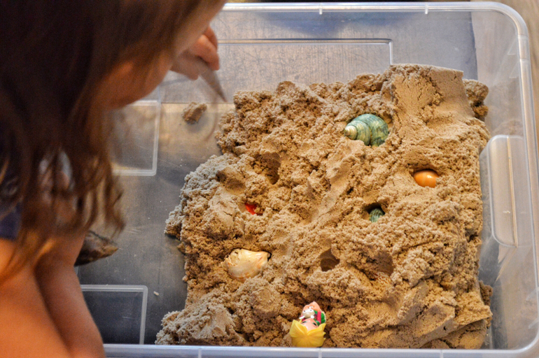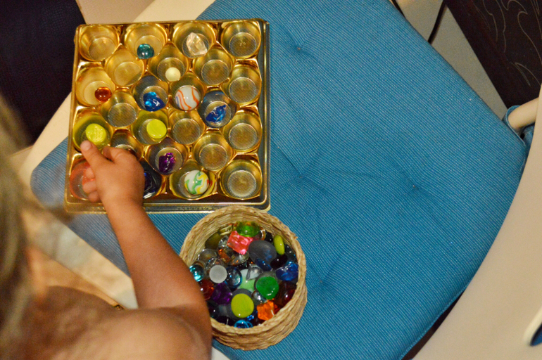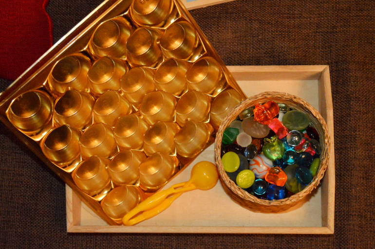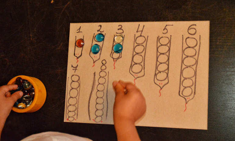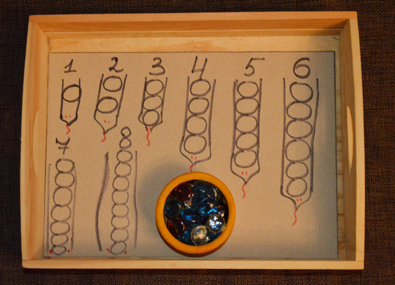 Такого рода заданий можно придумать много: и с пластилином и с песком. Основная цель: прочувствовать количества и постепенно перейти к простому счету. Среди, например Монтессори материалов есть прекрасный Банк золотых бусин, штанги и ещё много всего для изучения математики. Мне вообще очень нравится то как в М-школах подходят к изучению чисел, умножения, деления. Все можно посмотреть, потрогать и понять. А не просто выучить наизусть таблицы. Ну почему нашу систему обучения не адаптируют под более интересную и понятную.