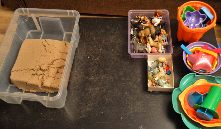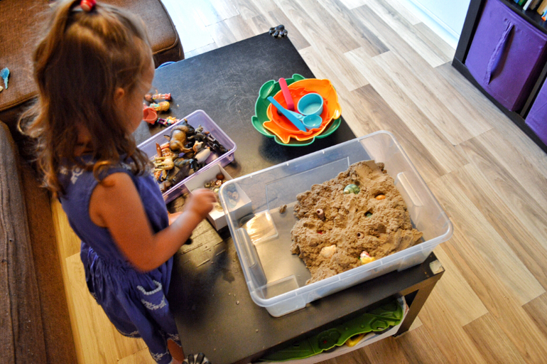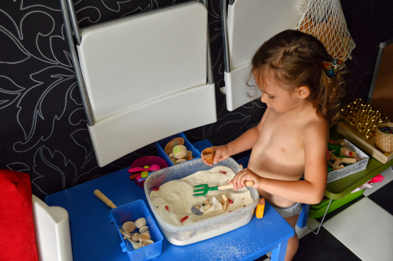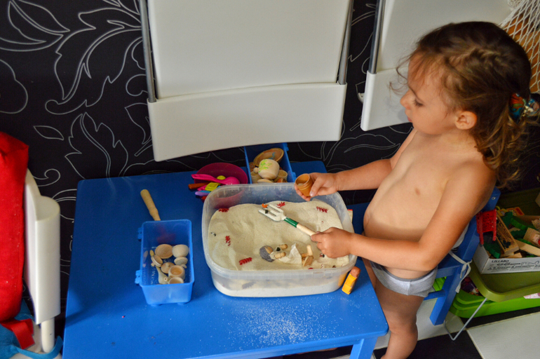 Сейчас у нас появился чудесный икеевский стол с отверстиями под ящики. Их используем для песка и пластилина. А до этого песок выкладывался вот таким образом. И Даша могла играть в волю))