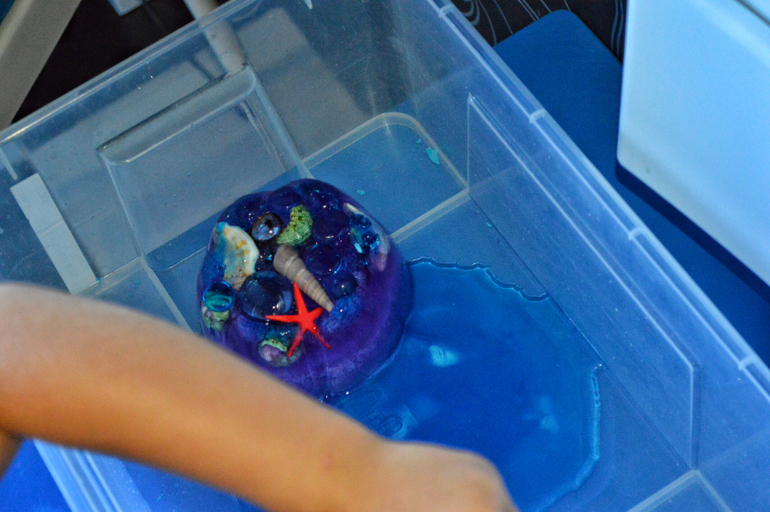 А вот игры со льдом пользуются большой популярностью. Мало того, что это реальный опыт с переходом воды из одного состояния в другое, так ещё и театрализованное представление с добычей морских сокровищ из недр айсберга.
