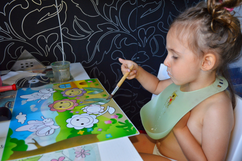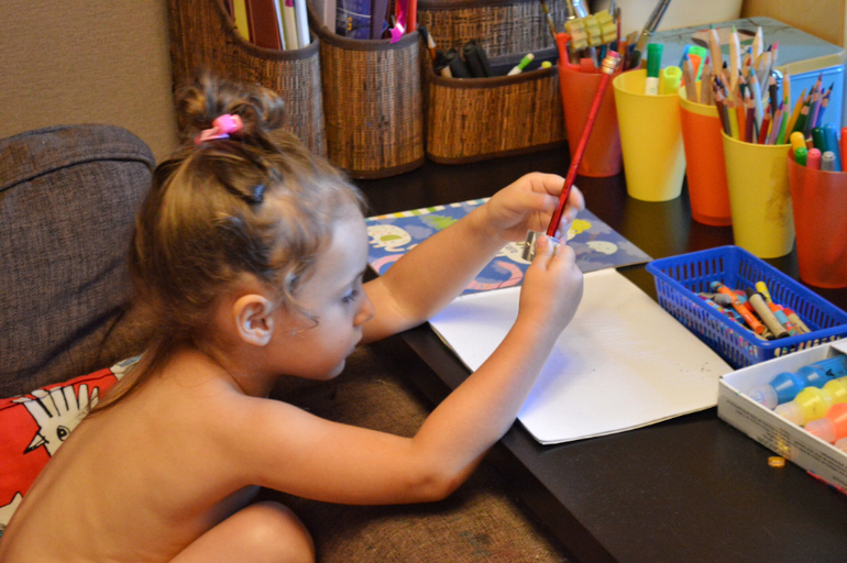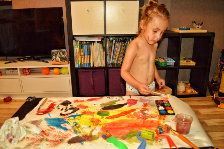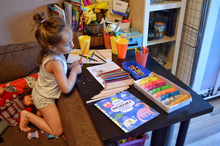 Вот так выглядело Дашино место для рисования раньше. Вроде она приноровилась, но рисовала сама очень мало, я писала об этом. Сейчас мы разобрали детскую кроватку и на ее место прекрасно вписался стол из Икеи с отверстиями для песка и пластилина, над которым прибиты полочки с красками, бумагой, альбомами, карандашами. И вуаля! Дочь бОльшую часть времени проводит за рисованием сейчас. Это тонны работ гуашью, акварелью, пастелью. Ну... работ почти 4-х летки конечно))¿