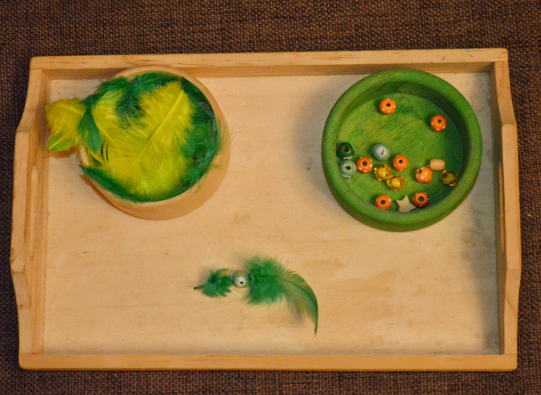 Классный тренажёр за 3 руб. Шнуровки уже поднадоели, и я предлагаю более тонкие варианты исполнения. Здесь бусины и пёрышки. Можно предложить ребёнку "сшить" удивительные украшения например.