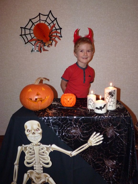 Я люблю Хэллоуин, для меня этот праздник - возможность перевоплотиться в какого-нибудь персонажа, подурачится, пошалить)) В этом году мы ходили в детский клуб на праздник и устроили дома небольшую фотозону вместе с сыном) Он мне помогал вырезать тыкву и раскрашивать свечи) Вот такой уголок дома у нас получился)