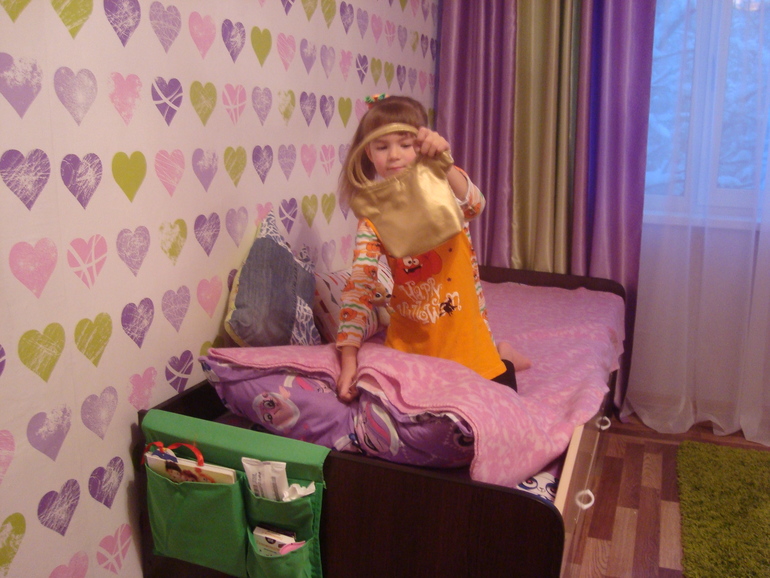 Сначала Тася искала подсказку по типу игры "холодно-горячо" Нашла под подушкой сумочку