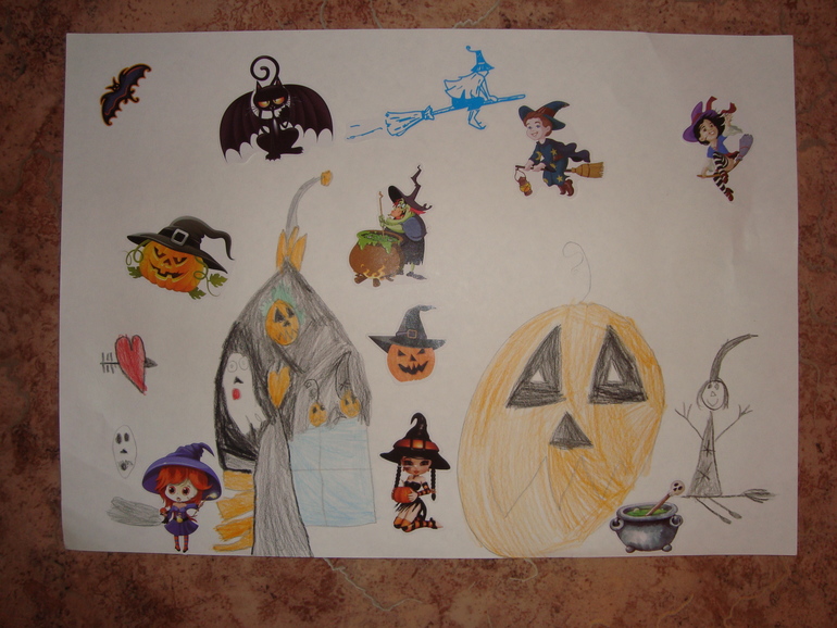 Тася нарисовала картину на тему Хеллоуин и украсила тематическими наклейками.