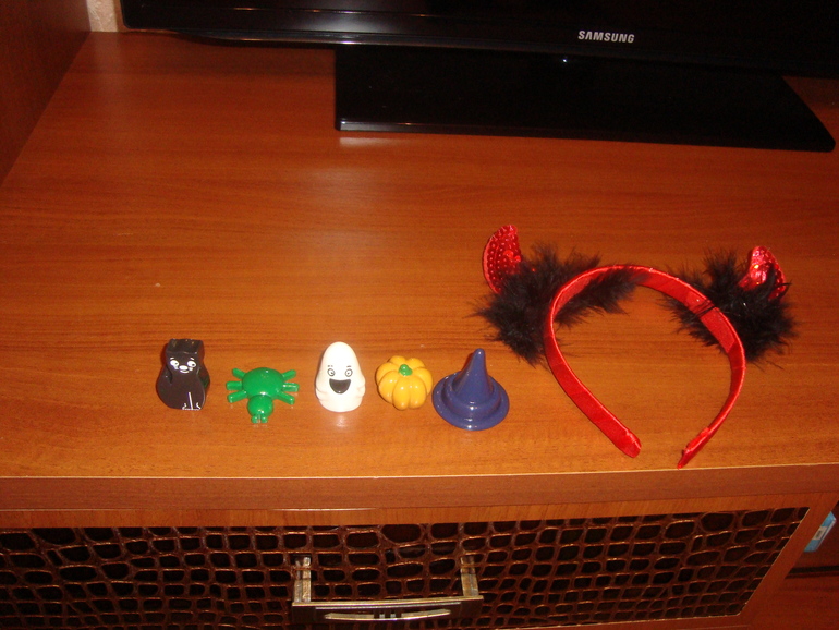 Теперь выдаю Тасе сумку с предметами и прошу выбрать только те, которые связаны с Хеллоуином.