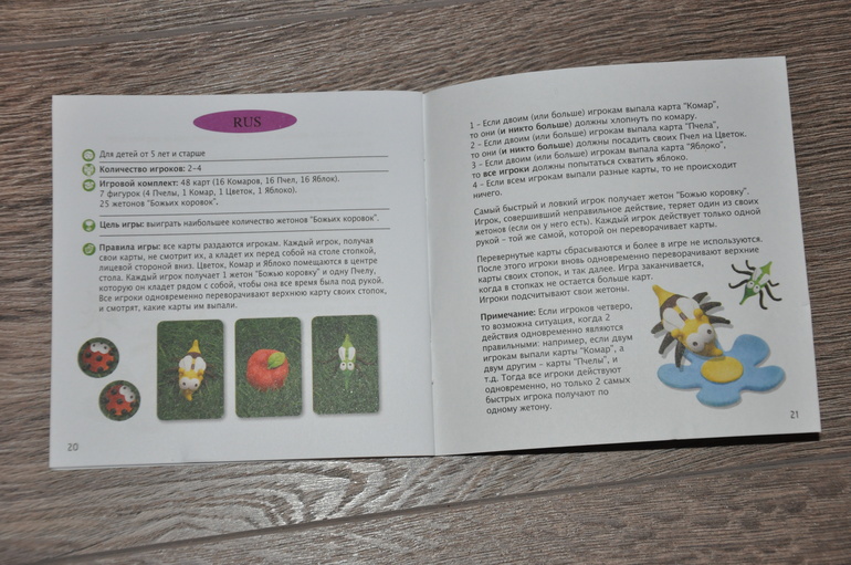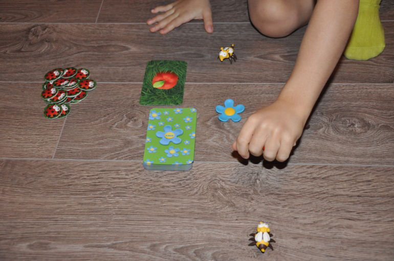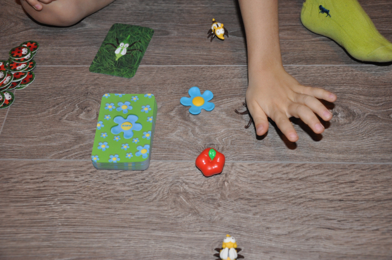 Цель игры - собрать как можно больше жетонов "божья коровка". Получить их можно, быстрее всех выполняя соответствующее открываемой карточке действие: