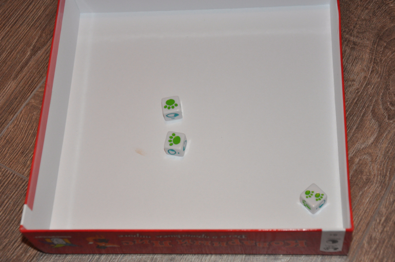Действие, которое игрок планирует совершить, он должен объявить перед началом хода и для того, чтобы его совершить,необходимо, чтобы на всех 3х кубиках выпало именно это заявленное действие (лапы - для подсказок или глаза для подозреваемых). Бросать кубики можно до 3 раз за 1 ход, добрасывая необходимые кубики.