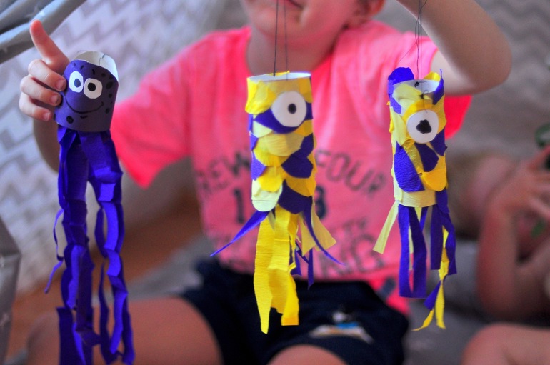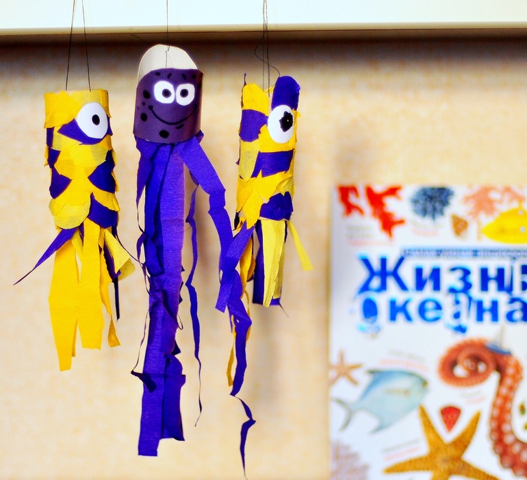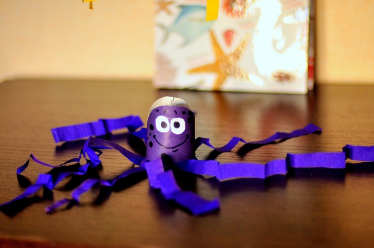 Втулку обклеили цветной бумагой, немного обрезали, сделали голову более округлой, наклеили глазки, снизу, Егор сам, вырезал и прикрепил из креповой бумаги щупальца 😁