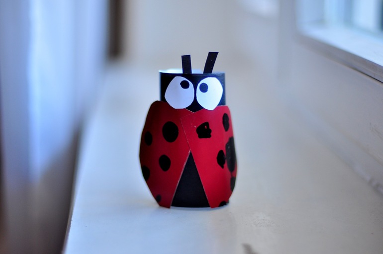 Обклеили втулку чёрной бумагой, из красной бумаги вырезали круг , его разрезали на две части - это крылья, одно крыло я оформляла сама, второе Егор 🙂🖐