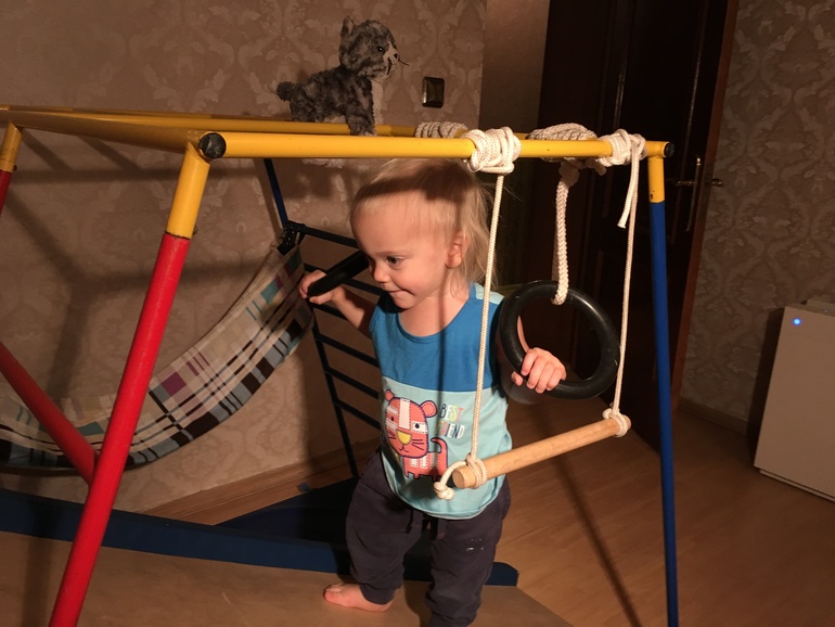 Крупная моторика. Практически весь месяц жили без Раннего старта, фитбола и гимнастики. Сначала акклиматизировались с соплями, затем болела я, потом переезжали, долго не могли собрать Спорткомплекс и купить новый фитбол. Наконец РС собран, фитбол куплен - возвращаемся в прежнее русло. Капитально отвыкли от физкультуры. На спорткомплекс сначала боялся залезать, но вскоре осмелел благодаря любимой кошке. Освоили вис на кольцах и турничке , почти что забирается "на крышу", в раздумьях проскальзывает в гамак через промежуток между последними перекладинами. Еще немного и перейдём к более сложным заданиям.