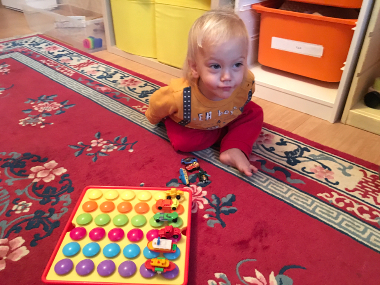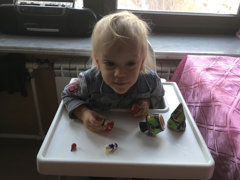 Вариант с крышечками пока самый удачный. Внимательно изучаем всех персонажей, переворачиваем "рубашкой" вверх и по моей просьбе ищем кого-то одного. Угадал - следующий ход твой, нет - мамин. Четко усвоил. Ну и аналогичный вариант с "парочками". Только надо найти пару. Неверно перевернутые картинки оставляем открытыми - нашёл пару, она- твоя)