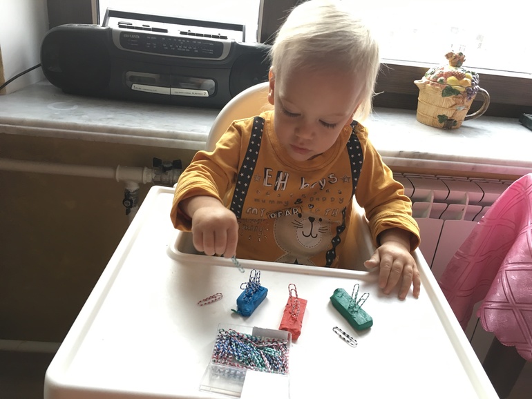 Мелкая моторика в этом месяце была отдана на откуп природе и повседневности. На днях вернулись к пальчиковым играм и массажу кистей рук, любимым мелочам типа пуговиц и пр. Все очень нравится - хохочет.