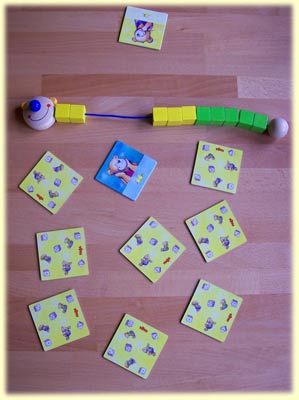 Подготовка к игре: Поместите веревочку Медвежонок с кубиками по середине стола. В этой игре все вместе соревнуются с Умным Медвежонком. Передвиньте все кубики к хвостику, т.е. к деревянному шарику. Перемешайте 10 карточек и разложите на столе изображением вниз.